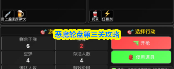 恶魔轮盘第三关双方各6血,每回合可选4个道具。首轮实1空2,优先自射拼概率;次轮实4空4,先自射探路再攻恶魔;第三轮实3空2,有道具就攻敌;末轮实4空2,全力进攻并用光道具。精准计算、压制节奏即可获胜。