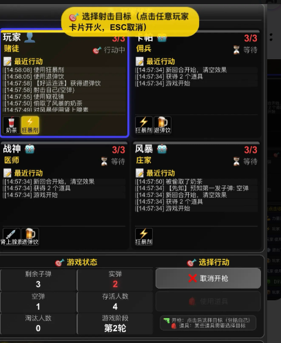 3、开枪思路:有道具剧使用道具,优先对自己开枪,实弹概率为三分之一,若是空弹第二枪对着恶魔